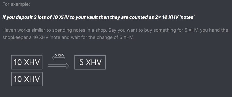 For example, suppose you bought 100 XHV on an exchange and sent it to your wallet. Unless you manually split that amount in your wallet, it will be treated as one note. This means that if you want to send 50 XHV to one person and the other 50 XHV to another, you have to wait until the first 50 XHV transaction completes before sending the second one.