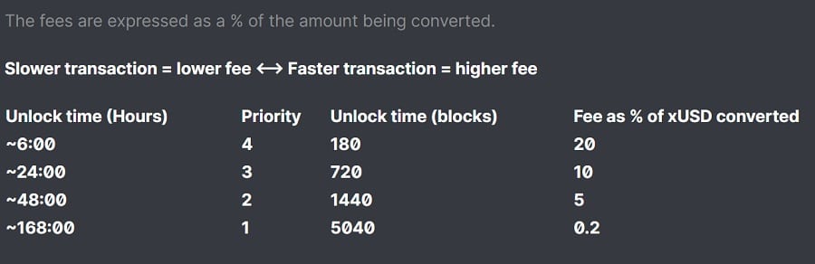 This might seem silly given that transactions on Haven Protocol only take a couple of minutes, but it makes sense once you factor in the second feature: the unlock time between xUSD and XHV. This unlock period can range from 6 hours to 7 days. This is to prevent people from manipulating the xUSD mint and burn mechanism (which happened during the first two months of its release).