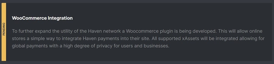 Haven Protocol is also currently in the process of integrating with WooCommerce. This will make it possible for XHV to be used as a payment method with various merchants using WooCommerce. This would not be particularly noteworthy were it not for the fact that they intend to make it possible to also pay for services using xUSD and other xAssets.