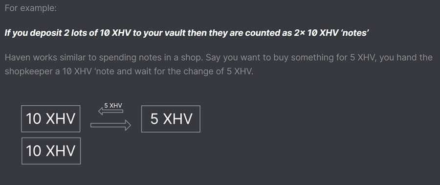 For example, suppose you bought 100 XHV on an exchange and sent it to your wallet. Unless you manually split that amount in your wallet, it will be treated as one note. This means that if you want to send 50 XHV to one person and the other 50 XHV to another, you have to wait until the first 50 XHV transaction completes before sending the second one.