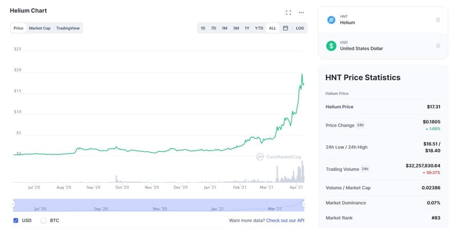 Of course, soon after it began to respond to the broad-based altcoin rally of early 2021 and price turned parabolic, finally reaching an all-time high of $21.17 on April 7, 2021. At this price most users will easily recover the cost of a Hotspot within a month, if not within days in some cases.