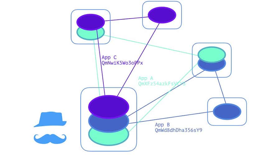 Network topology of five agents running three different apps. Every app is it’s own p2p network. Source