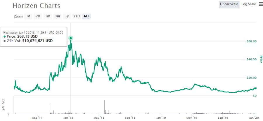 ZEN Price Performance. Image via CMCThe all-time high was $67.29 set on January 10, 2018 and the all-time low was $3.09 set on July 31, 2017 which was just two months after ZEN started trading. The coin did come very close to that all-time low recently, however, touching $3.14 in September 2019.
