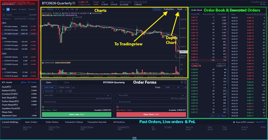 Huobi Futures Platform User InterfaceWhen it comes to the charts, there are three different options for you. These are either the standard Huobi chart, the market depth chart or the tradingview chart. For those of you who don't know, Tradingview is one of the best charting packages on the market. It is often used by technical analysis traders.