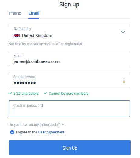 If you would like to give Huobi Derivatives a go then you will need to create an account. This is actually pretty simple. All they require to complete the signup is a phone or email address as well as your nationality.