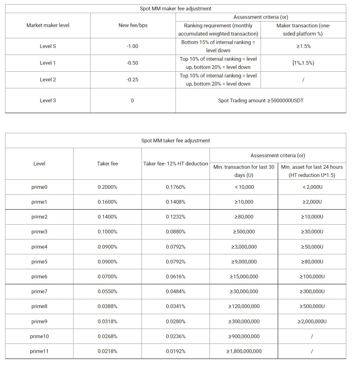 HTX has a tiered fee structure similar to OKX, Binance and KuCoin. Trading fees are dependent on volume and the more Huobi Tokens are held by the customer, the greater the fee discount. If the trader has less than 10 HT, they will be charged a basic rate of 0.2% per trade. Here is a look at the fee table for maker and taker fees: