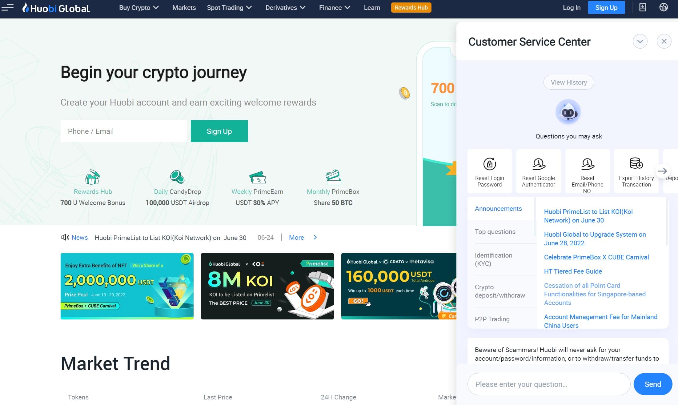 A Look at the Huobi Global HomepageHTX Exchange has a very strong presence in the Asian markets and was originally based in China. After increasing regulatory crackdowns, HTX relocated to the Republic of Seychelles. HTX has physical locations in South Korea, Japan, Hong Kong, Singapore, and even opened an office in the United States in 2018, but had to close due to regulatory reasons. An interview between HTX co-founder Du Jun and CNBC explained that they are working towards re-entering the US market as soon as they can get the proper licensing in place.