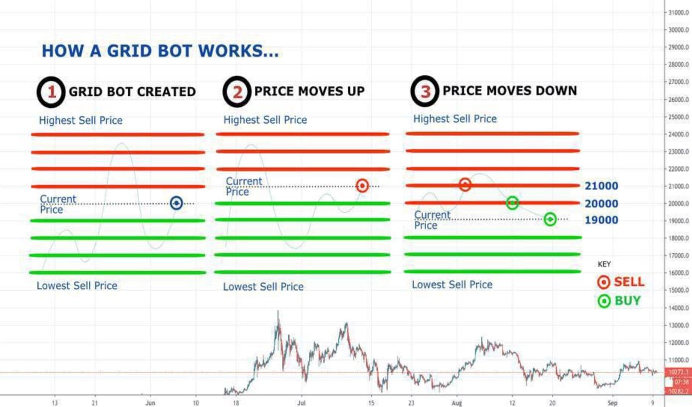 Here is a great visual from Coinmonks showing how grid trading works, and what the bot will be doing: