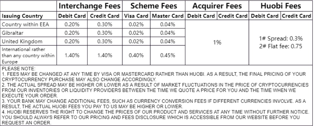 HTX fees are quite low among the major exchanges for trading fees and fiat deposits via bank transfers, while fees for crypto purchases with card are average. Let's break down the different fees: