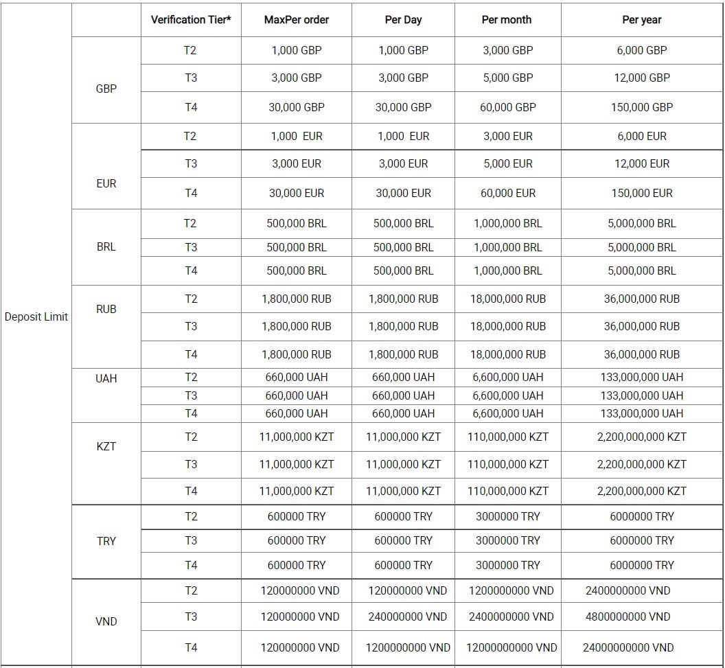 For higher deposit thresholds, here is a table showing the deposit limits per account verification tier: