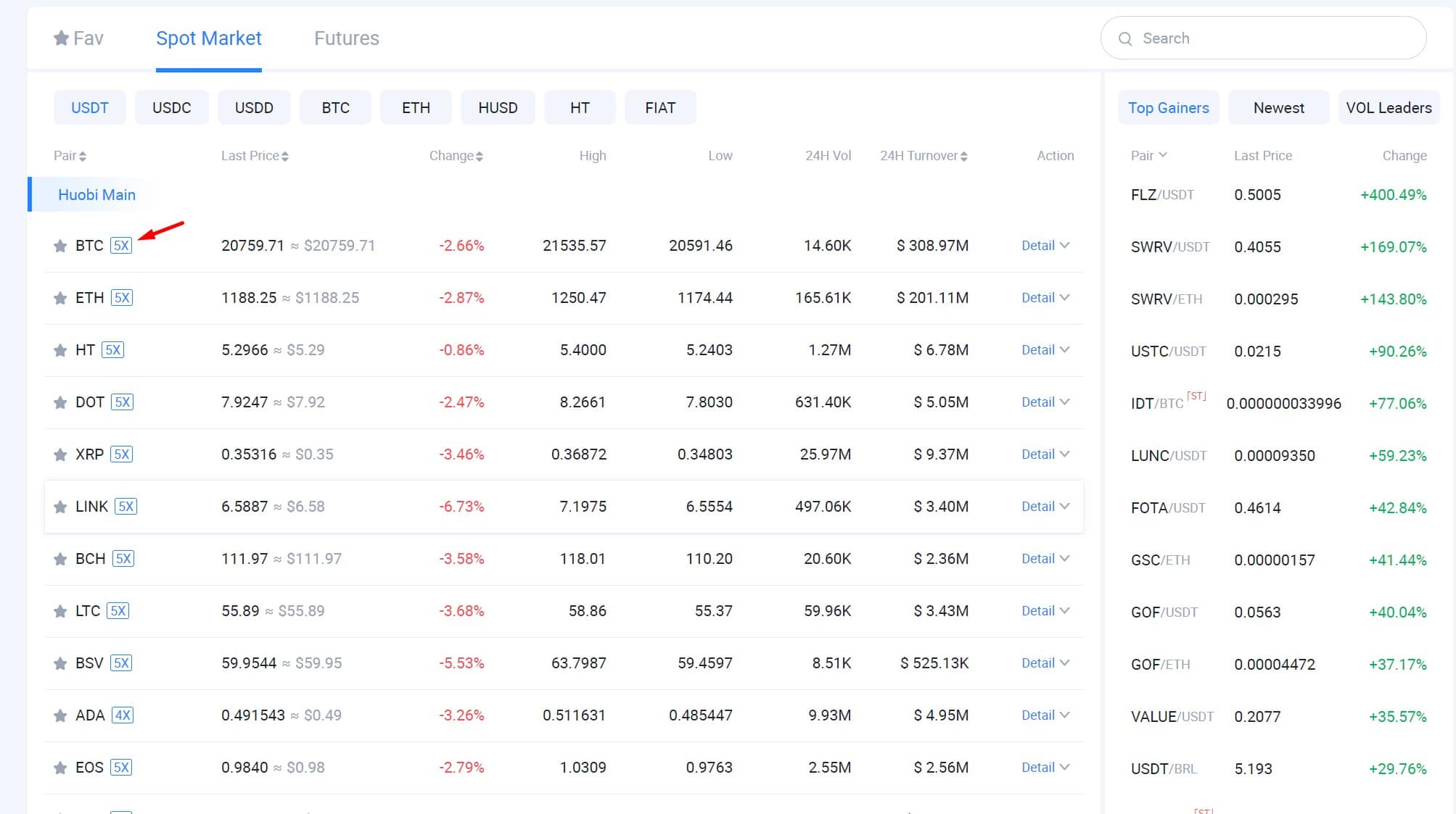 One of the biggest attractions to HTX trading is the fact that traders can access leveraged trading of up to 5x for spot markets on over 80 tokens. Tokens that are available for leveraged trading on the spot market can be identified by the number shown in a blue box and the letter ‘x’ beside the token as seen below: