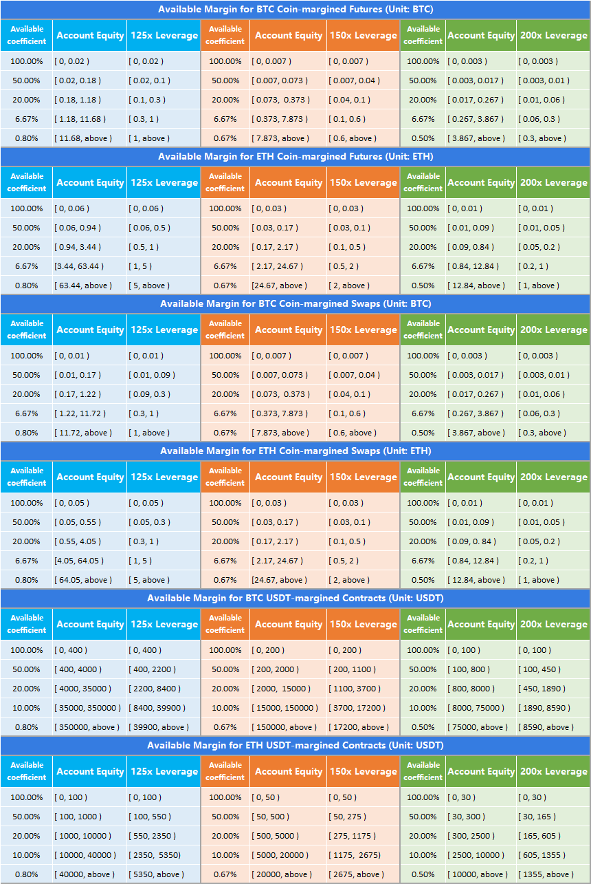 Traders can access up to 200x leverage on certain derivatives products and Coin-margined futures. Margin availability on futures contracts follows a tiered structure as you can see below: