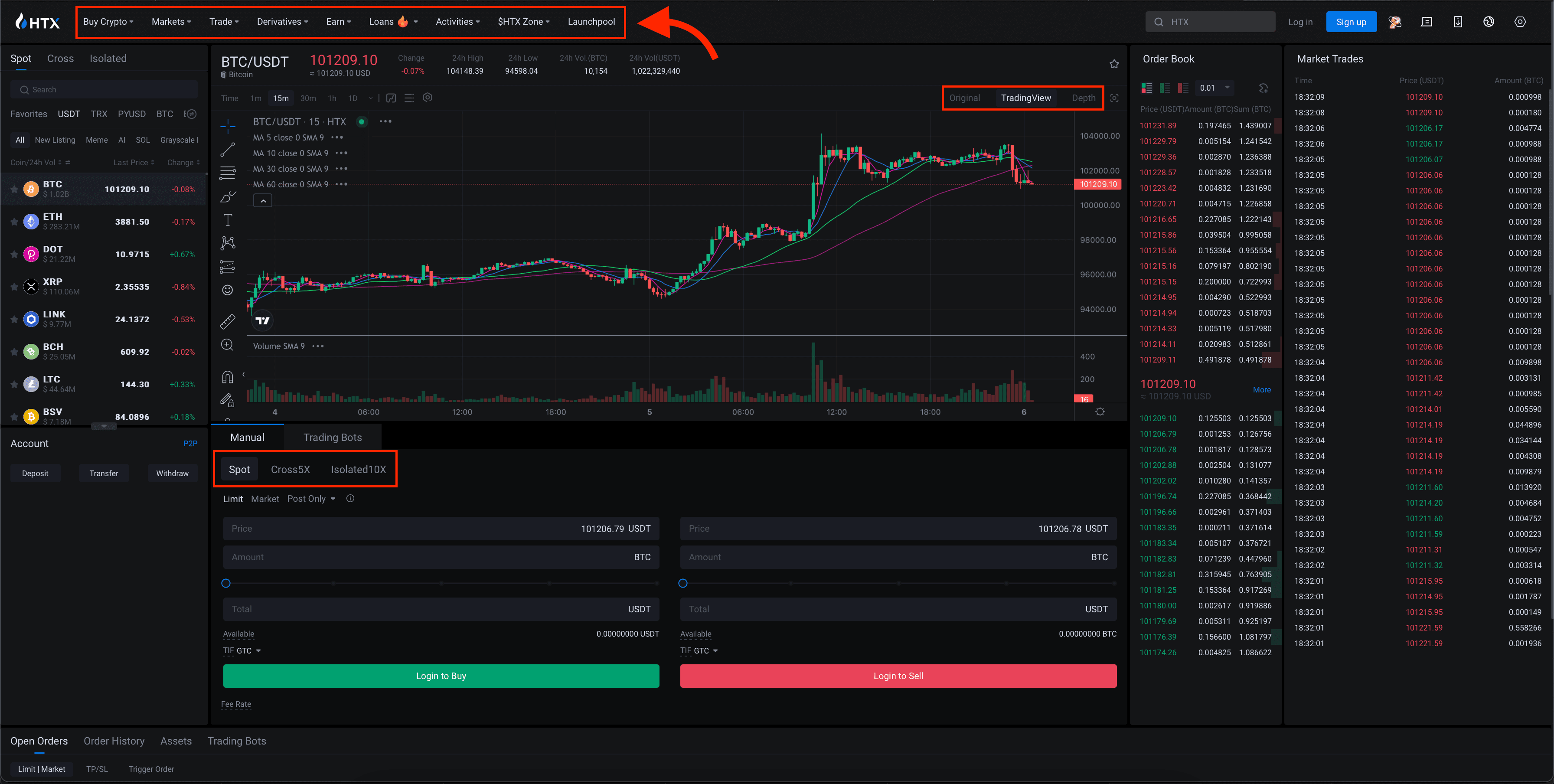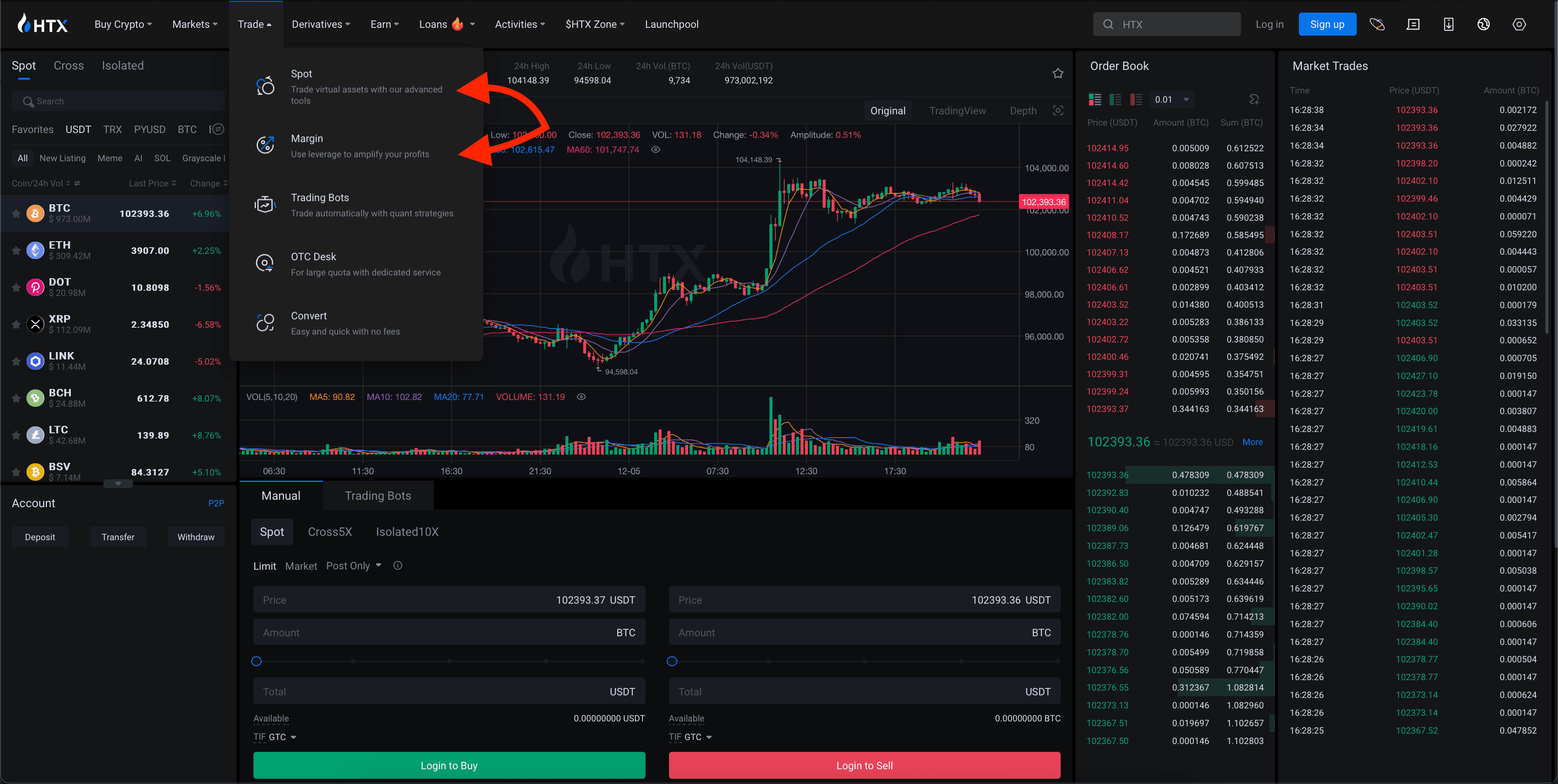 Image via HTXFrom the trading screen, traders will need to flip between Spot and Margin sections to bounce back and forth between leveraged and non-leveraged tokens, this can be done in two different ways as shown by the red arrows below: