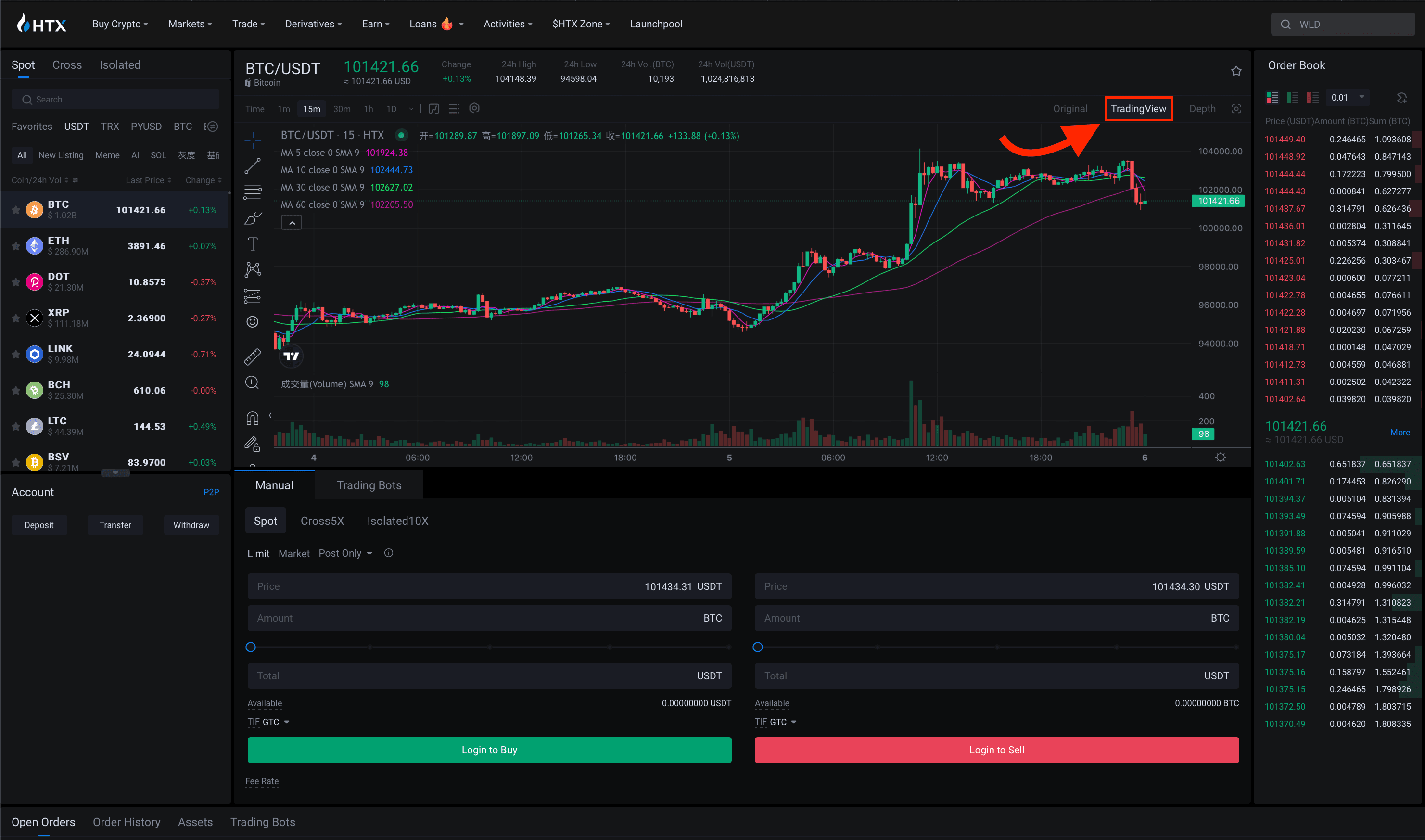 HTX Depth ChartTradingView- This will likely be the most common option and is easily accessible without having to leave the HTX trading interface which is very convenient.