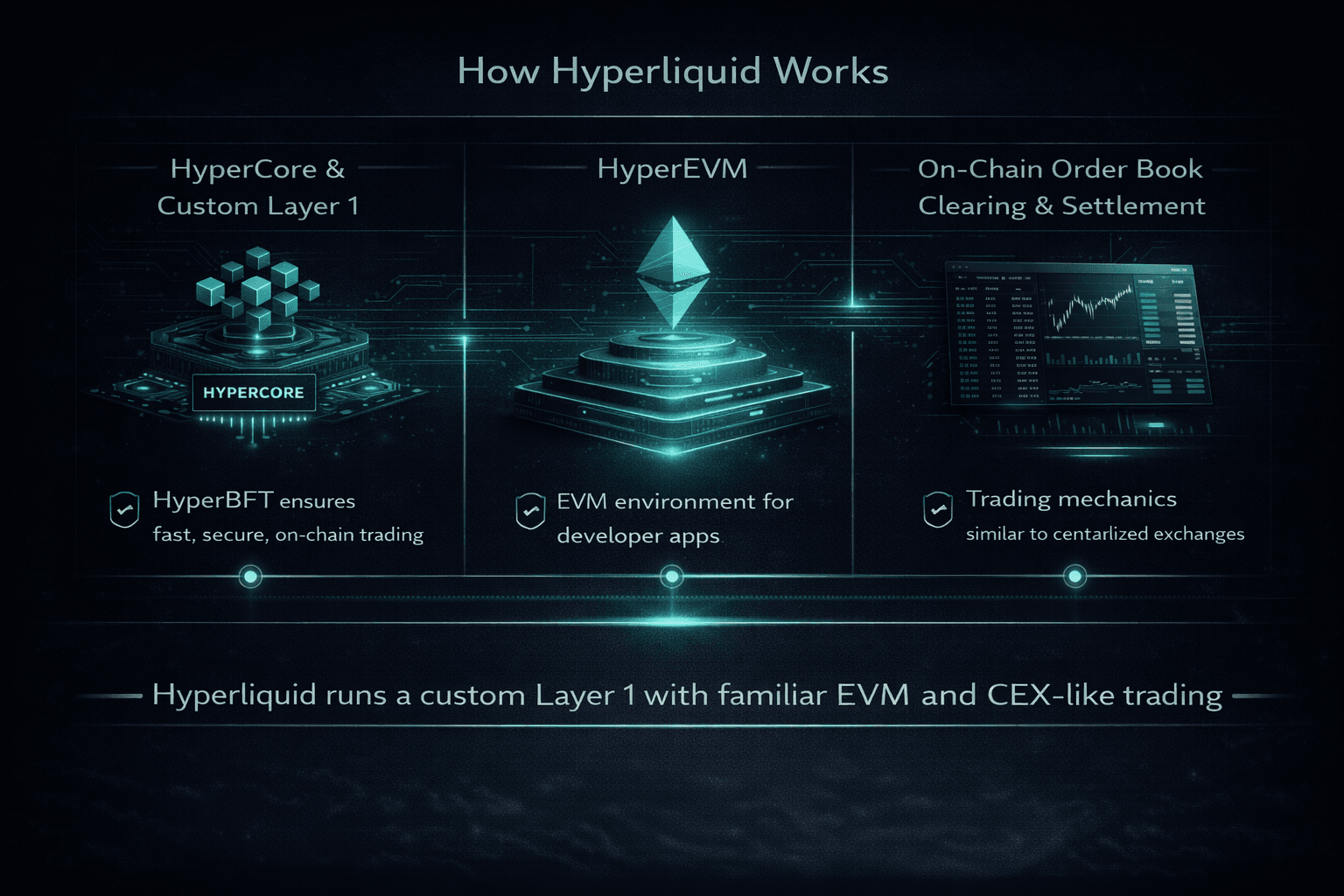 Rather than using Ethereum or another host chain for execution, Hyperliquid runs on its own Layer 1 blockchain. This chain uses HyperBFT consensus and splits execution between HyperCore and HyperEVM.