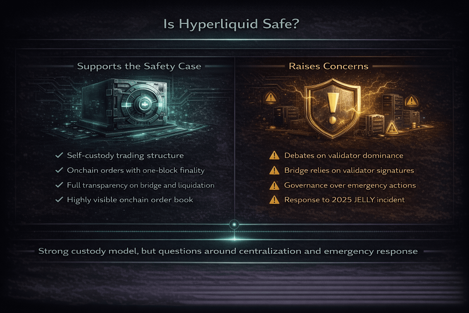 Safety on Hyperliquid depends on what kind of risk you mean. For users worried about exchange custody, the platform has some real strengths. For users worried about governance, market structure, and emergency intervention, the picture is more mixed.