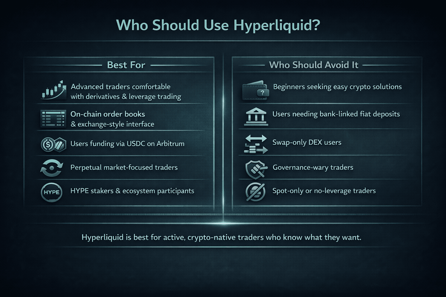 Our take: Hyperliquid is one of the best perpetual DEXs for advanced traders, but not the best fit for beginners or users who want maximum decentralization.