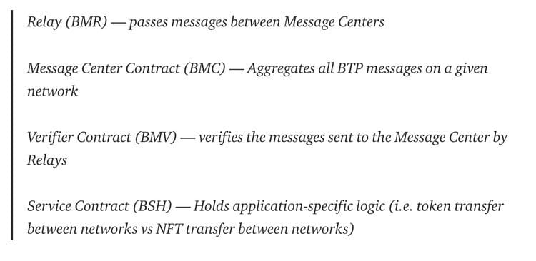 I found this and this article extremely helpful, so if you wish to learn more about how BTP works, I suggest you give them a look. The BTP is made up of four different components (covered below). To explain simply: if you send a transaction, you’ll be interacting with the Service Contract. This will be transferred into the Message Center Contract, where all transactions are gathered. After this, Relays (run like node operators by individuals) will take your transactions and submit them to the chain you want to send your coins to. Then to prevent any malicious transactions by Relays the Verifier Contract checks if that transaction can be found on the ICON blockchain, which is governed by its own consensus mechanism I linked to earlier.