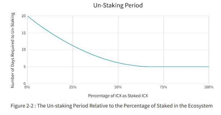 The ICX un-staking period graph. Image via IISS PaperThis period can be extended indefinitely and likewise depends on the amount of ICX being staked on the network (the less ICX is staked, the longer you must lock your funds). Staking on the ICX network essentially involves voting for a P-Rep and simultaneously delegating your ICX them so they can vote on changes to governance variables. ICON documentation calls this Delegated Proof of Contribution (DPC).