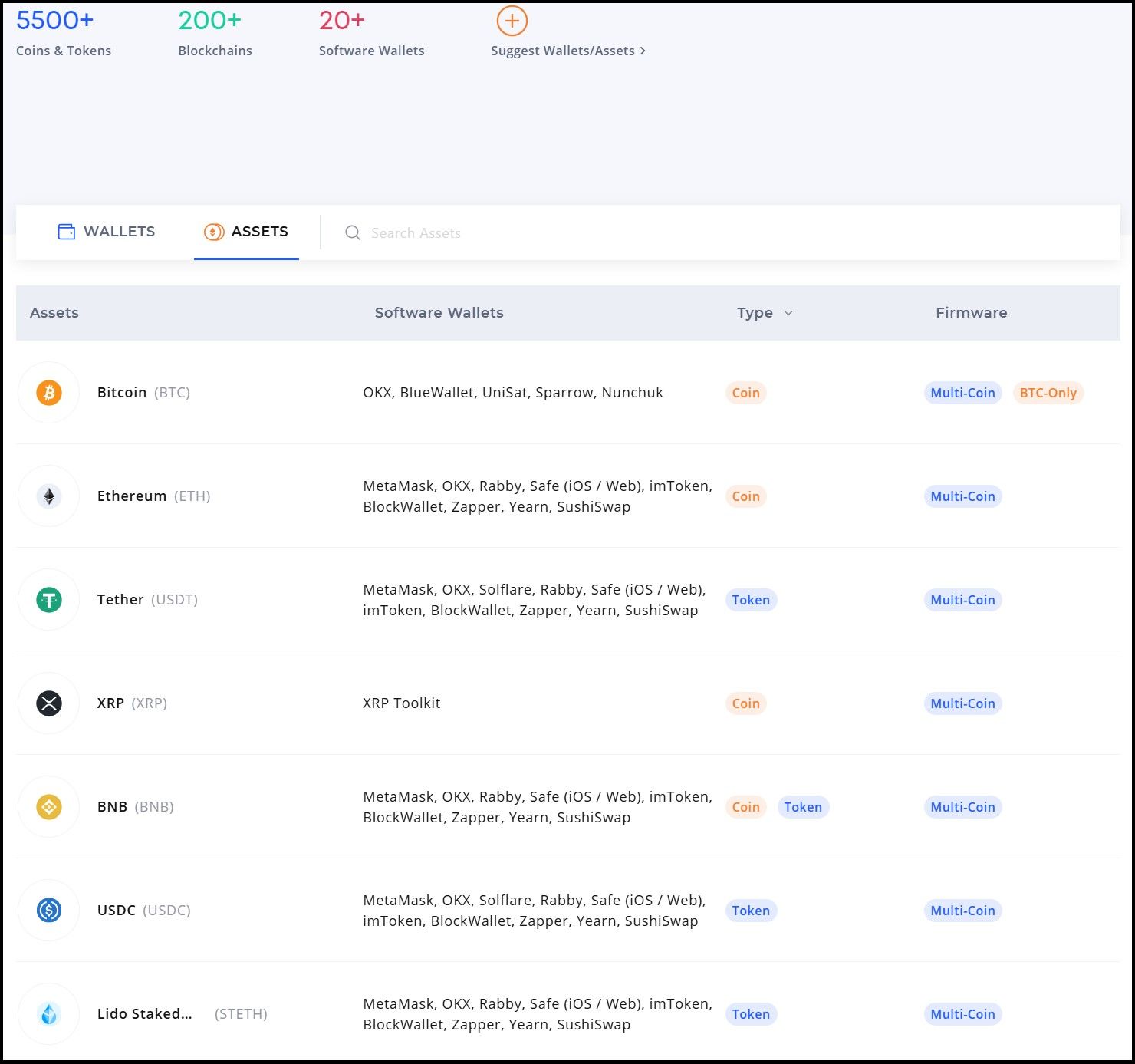 Keystone Wallet Supported AssetsHowever, Keystone's approach to coin support differs significantly from competitors like Ledger, which utilizes its proprietary Ledger Live app to provide a seamless user experience for managing a broad array of assets. Through Ledger Live, users can access and manage thousands of coins and tokens, and for those not directly supported by Ledger Live, additional support is available through integrations with over 20 third-party software wallets. These include popular wallets such as MetaMask, OKX Wallet, Keplr, and BlueWallet. This multi-faceted integration strategy allows Ledger to cover a vast expanse of blockchain networks efficiently.