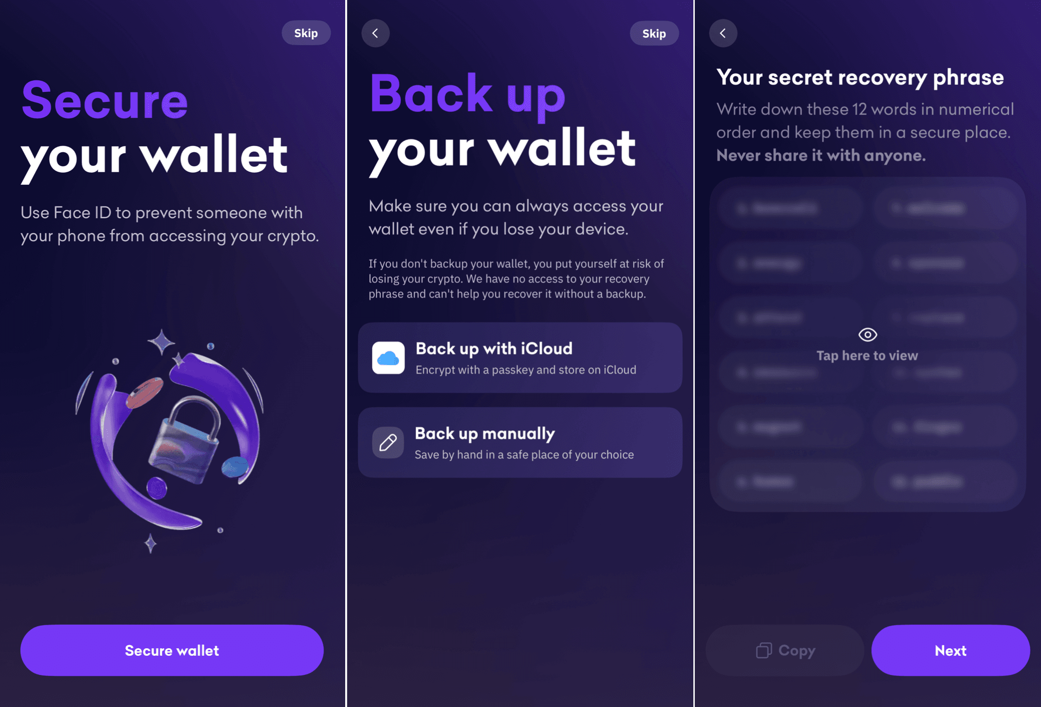 Additionally, the wallet allows you to store an encrypted backup of your recovery phrase on cloud services like iCloud, safeguarding against unauthorized access while protecting against loss of access to your funds.