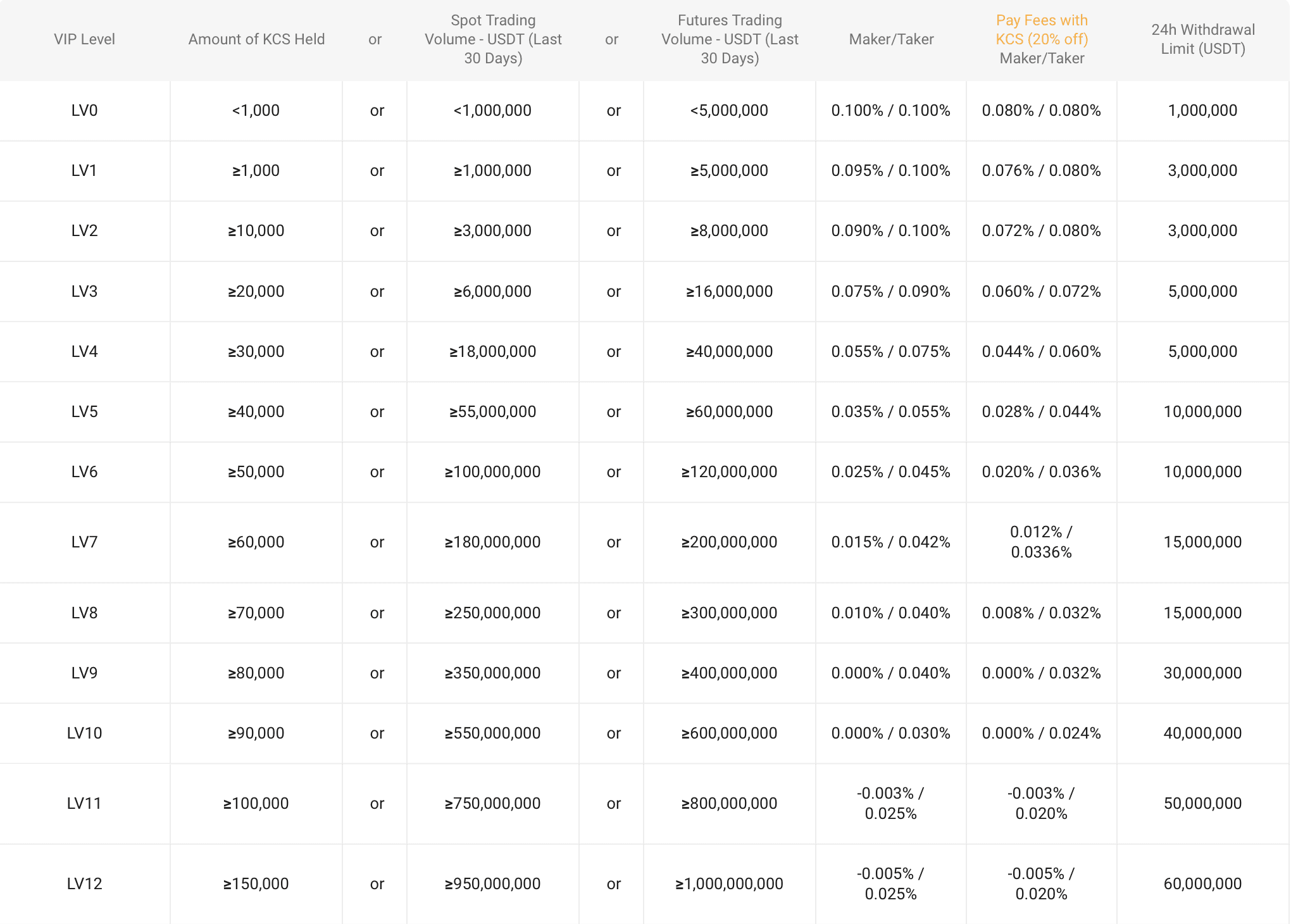 KuCoin Trading FeesKuCoin utilizes a maker/taker fee model and is one of the lowest fee names in the game. The fees are based on a rolling 30-day trading volume, and/or the number of KuCoin’s KCS tokens held. KuCoin users can lower the already low fees by an additional 20% if they opt-in to pay their fees in the KCS token.