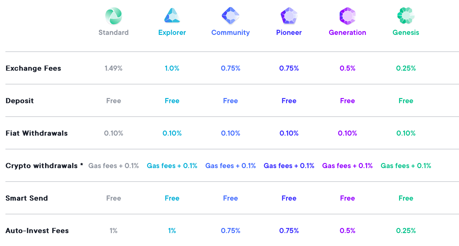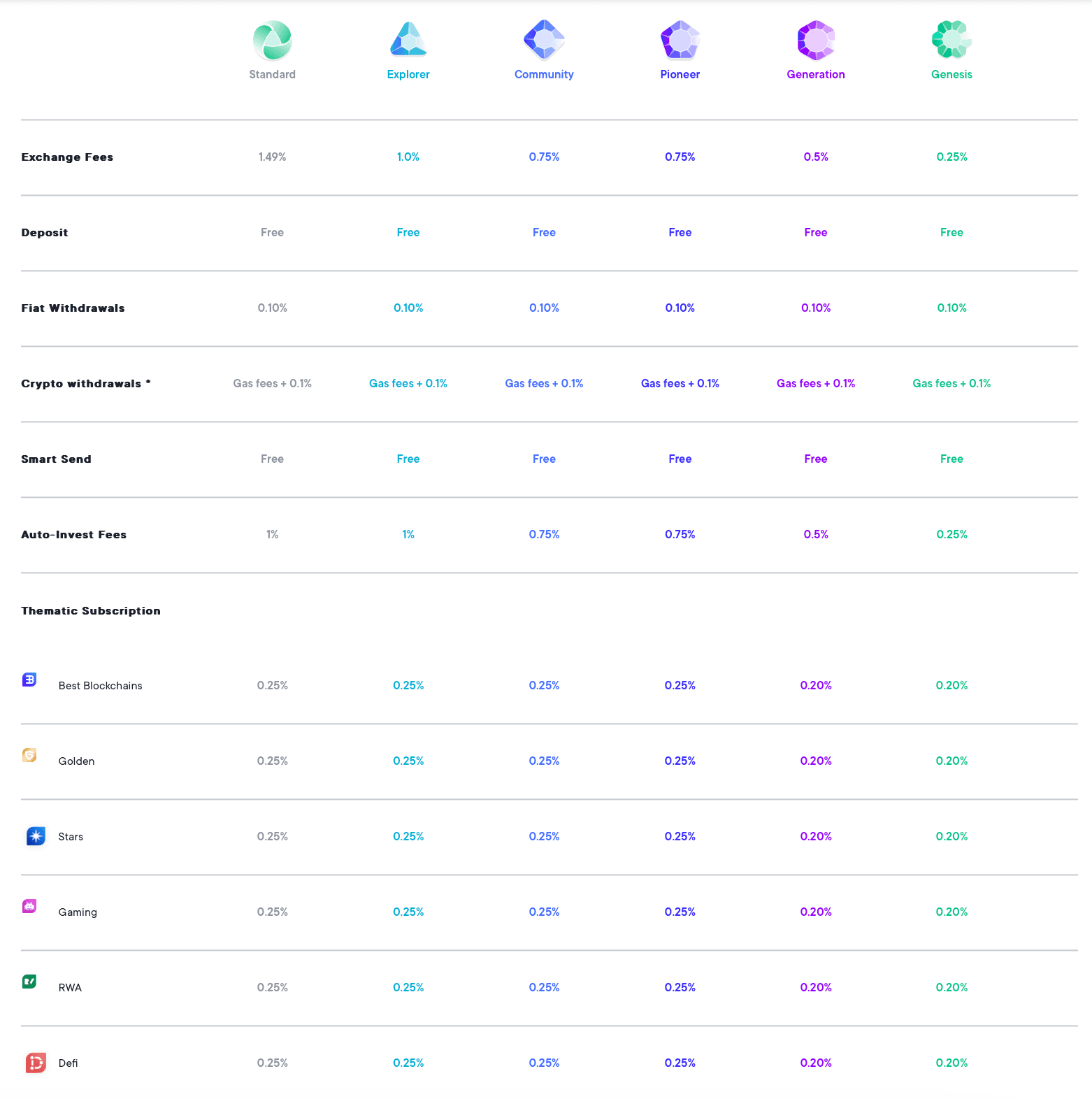 A Look at SwissBorg Benefit Tiers. Image via SwissBorgExchange fees will vary from 1.49% at the most to 0% at the lowest for users in the Genesis level. SwissBorg has no deposit fees and crypto withdrawal fees are dependent on the network and an additional 0.1% fee charged by SwissBorg.