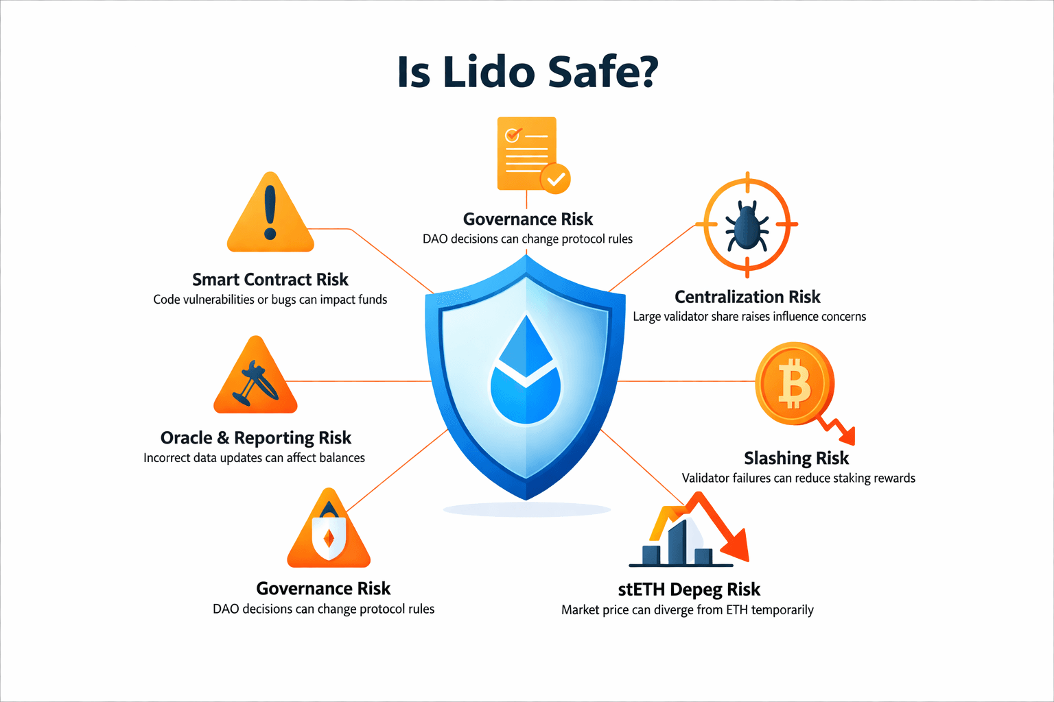 Yes. Lido is safer to think about as a bundle of risks rather than a yes-or-no trust question. It is non-custodial, which means users are not handing coins to an exchange that can freeze withdrawals or mismanage balances. But non-custodial does not mean risk-free. With Lido, the main exposure shifts toward smart contracts, oracle reporting, governance, validator performance, and the market behavior of stETH itself.