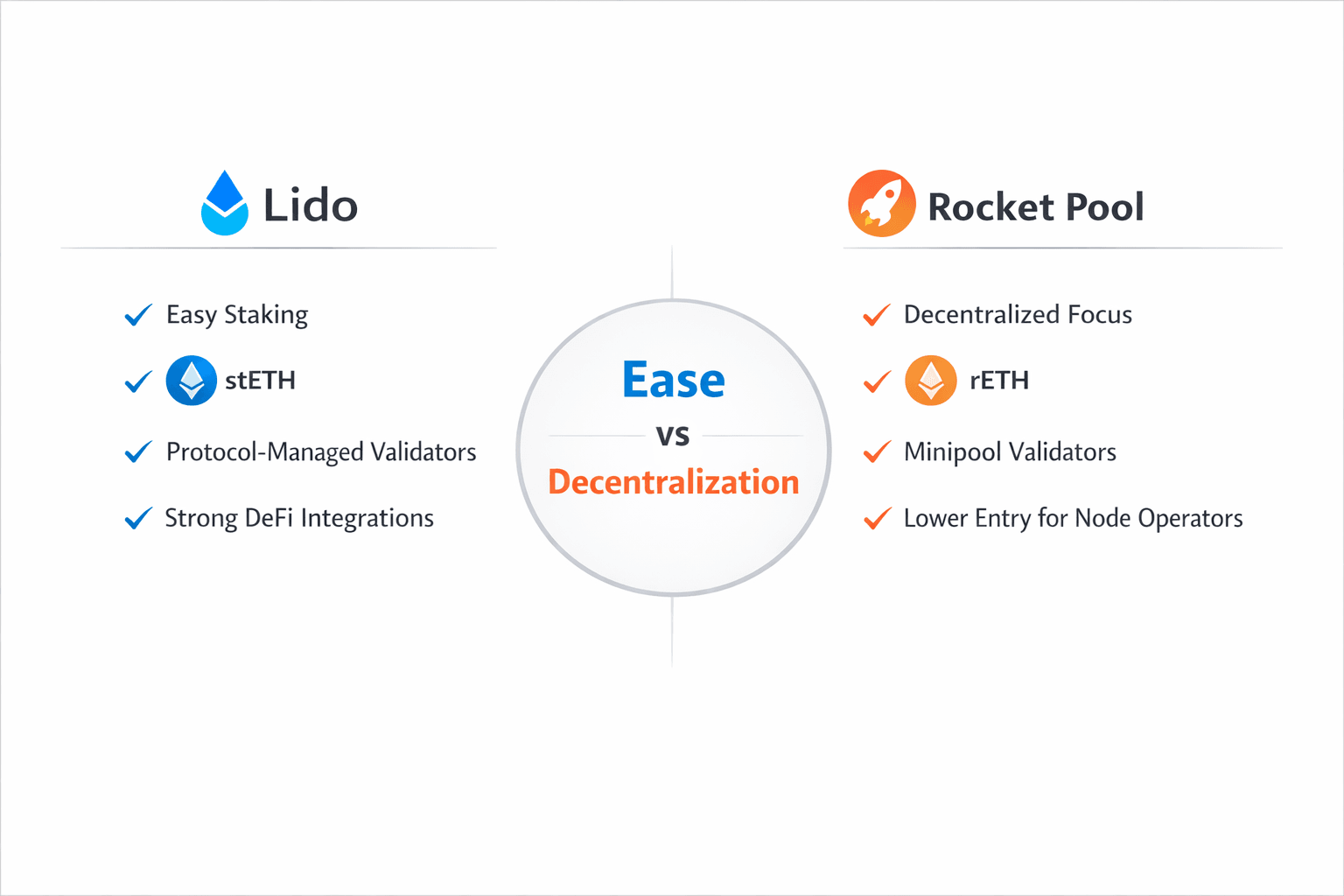 Two Staking Models With Very Different PrioritiesLido and Rocket Pool solve the same broad problem while taking very different routes to get there. Both let users stake ETH without running a full solo validator in the traditional sense, and both issue a liquid token that can keep working across the Ethereum economy.