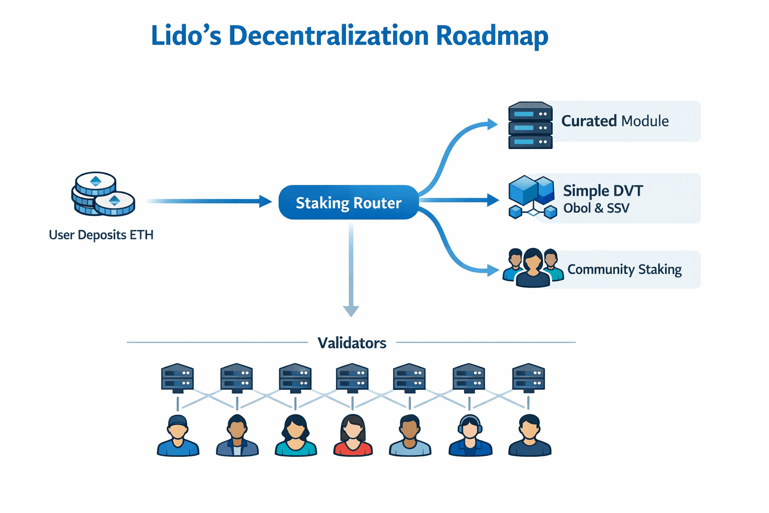 Distributed Validator Technology, or DVT, is one of the most important pieces of that roadmap. In plain English, DVT allows validator responsibilities to be split across multiple participants instead of being tied to one operator setup. That improves resilience because the validator no longer depends on one machine, one operator, or one operational point of failure in the same way. Lido’s Simple DVT Module was added as the second Staking Router module in Q1 2024, and it uses implementations from Obol Network and SSV Network.