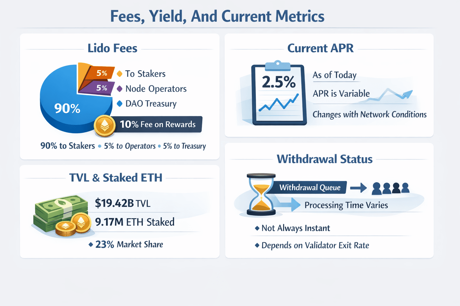 What Users Pay, Earn, And Watch On LidoThis is the section readers usually scan first, because this is where Lido stops being a concept and starts looking like a live product with moving numbers. The fee model is straightforward enough, but the yield and protocol size need to be read with more care. APR changes. Withdrawal timing changes. Protocol scale changes, too. So the useful way to frame this section is not as a list of permanent facts, but as a snapshot of how Lido looks right now and what those numbers actually tell you.