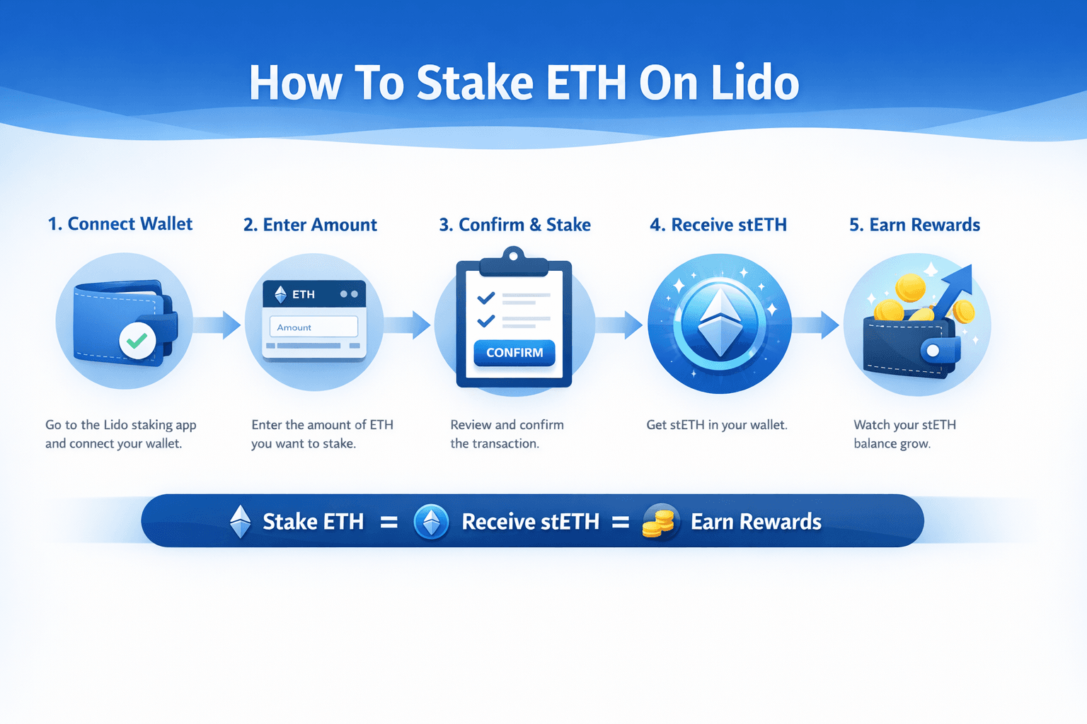 This is the part most readers want in plain English. The good news is that staking through Lido is not operationally heavy. You are not setting up validator software, handling 32 ETH, or managing uptime. You are connecting a wallet, depositing ETH, and receiving a liquid staking token in return. The complexity sits under the hood, not in the user flow.