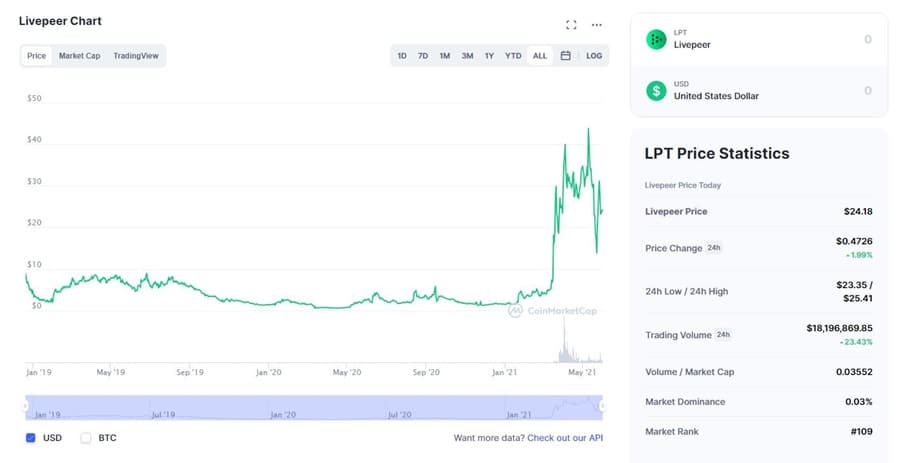 LPT has made its best gains in 2021. Image via Coinmarketcap.com That wasn’t the end however as the 2021 rally lifted the token back near the $5 level and then in March the token lifted off in response to the news of Grayscale adding a Livepeer Trust fund. Over the course of a month the token rocketed up to $39.99. From there it dipped to $28, but by May 11, 2021 it was at an all-time high of $45.22.