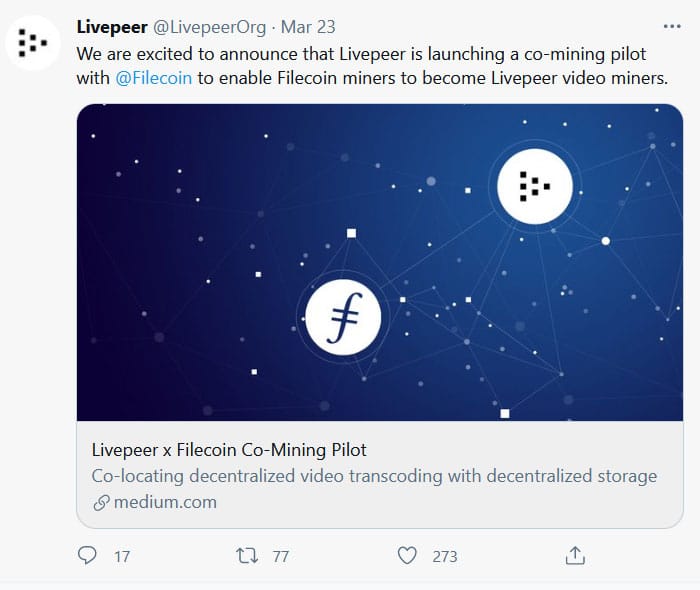 In March 2021 Livepeer announced the launch of a co-mining program with Filecoin, a decentralized storage platform. This allows users to mine and earn rewards on both networks simultaneously.