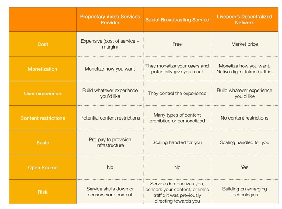 Livepeer versus competitors. Image via Medium.com As long as decentralized applications continue to gain in popularity and adoption Livepeer should be able to take market share away from the established video transcoding service providers.