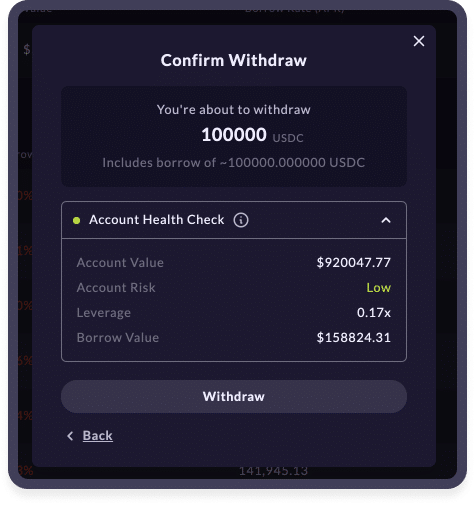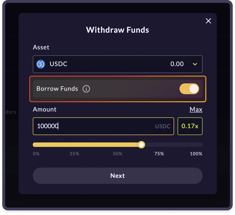 Once that's done, the UI will prompt you to select the asset you wish to withdraw and borrow and toggle 'Borrow Funds' on. Once you select the amount you want to borrow, click next. The final transaction page will highlight the account risk and leverage taken.