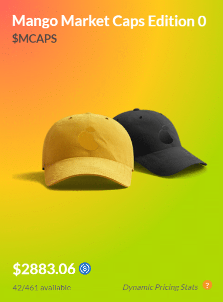 Mango Markets has its own line of tokenized merchandise called Mango Market Caps ($MCAPS), redeemable for limited edition wearable ‘Caps’.