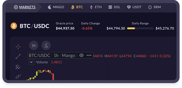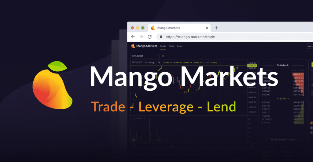 Mango Markets is a decentralized derivatives exchange built on the Solana blockchain. Its user-friendly interface allows users to lend, borrow, swap, and leverage trade crypto assets. Mango Markets allows assets deposited on the platform to be cross-collateralized, which means that assets can be shared as collateral between borrow/lending and leverage trading. These assets will automatically earn interest and serve as available collateral to leverage trade or withdraw a borrow.