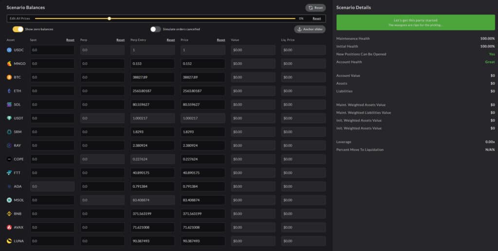 Traders can use the ‘Risk Calculator’ available on the Mango website to predict and estimate the various scenarios. The calculator allows users to input different future prices and simulate cancelled orders.