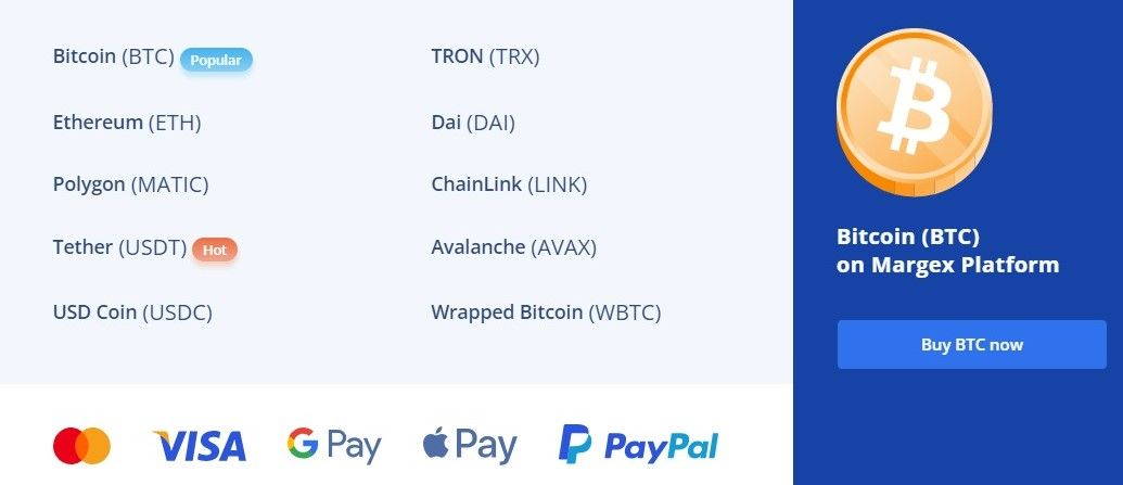 Margex allows users to purchase Bitcoin using major fiat currencies such as USD, EUR and GBP. Direct bank transfers are not available from Margex.