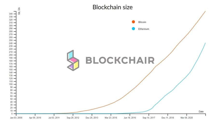 Naturally these transactions and events increase over time, and can even become exponential when the blockchain becomes extremely popular and heavily adopted. Eventually it may become impractical to store all the data and information. As an example, the Bitcoin blockchain size is 348 GB as of June 2021 and the Ethereum blockchain size is 248 GB as of June 2021.