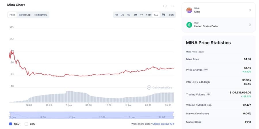 MINA tokens were first listed and traded on exchanges on May 31, 2021 and opened at a price of $9.90, but with the entire cryptocurrency market declining at the time the price has retreated significantly and sits at $4.88 as of June 3, 2021. That said, after hitting a low of $2.76 the price has been recovering steadily, and the token price does appear to be stable.