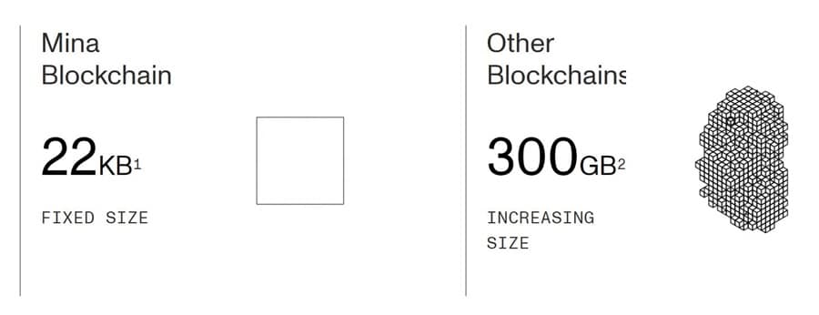Mina remains small and fixed in size. Image via Minaprotocol.com Maintaining a low resource requirement for verifying transactions in a block trustlessly is the first step to creating a sustainable and scalable solution to the problem of bloated blockchains and increasing centralization.