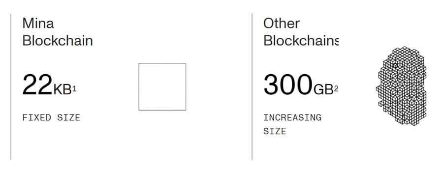 According to the developers of the Mina Protocol, its blockchain will always remain just 22 kB in size, no matter how long the blockchain exists, or how much activity occurs on it. This will ensure throughput remains high and that all stored records are easy to corroborate.