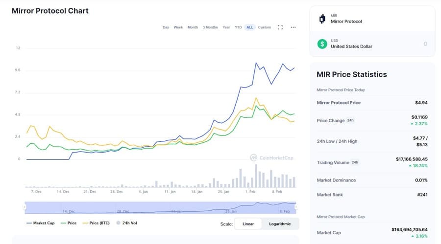 Just four years to release all the MIR tokens. Image via Mirror blog As of February 2021 there are 33,425,682 MIR in circulation. The market capitalization of the token is nearly $165 million and the token is #241 in terms of market capitalization on Coinmarketcap.com. The token should not be confused with the Mir Coin, which uses the same ticker, but is a transactional coin with its own blockchain and ecosystem.