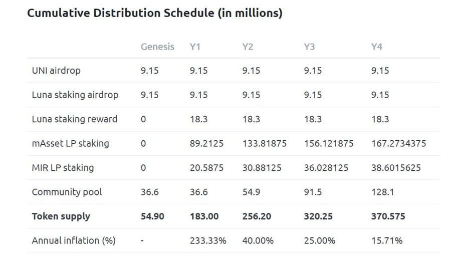 There was no pre-mine or ICO involved with the MIR token and the initial 18.3 million MIR tokens were airdropped to holders of LUNA and UNI. On November 23, 2020 each user with LUNA staked received MIR on a pro-rata basis and each UNI holder with at least 100 UNI received 220 MIR.