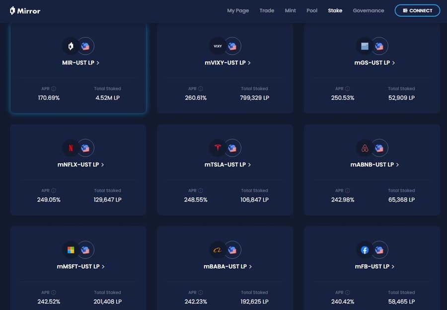 Stake coins at Mirror for some juicy yields. Image via Terra.Mirror.Finance The smart contracts used to create the synthetic assets and hold the collateral for such have been fully audited by the cyber-security firm Cyber Unit and have been found to be secure.