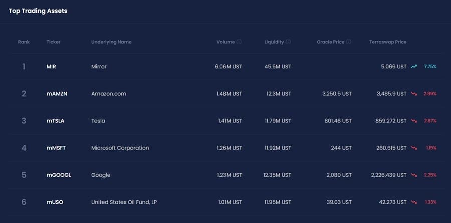 These include the Terraswap AMM from Terra and Ethereum’s Uniswap. In its current state the mAssets created mirror major U.S. equities and ETFs, but there are more assets planned for the future. You can see the platform and a full listing of the currently available assets here.