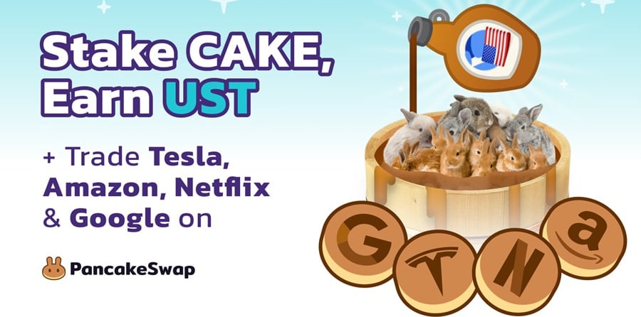 Stake CAKE and earn UST at Pancake. Image via Medium. Binance Smart Chain began with just a few of the Mirror contracts tradeable on the PancakeSwap platform. These four were mAMZN, mGOOGL, mNFLX, and mTSLA. More are planned for the future.