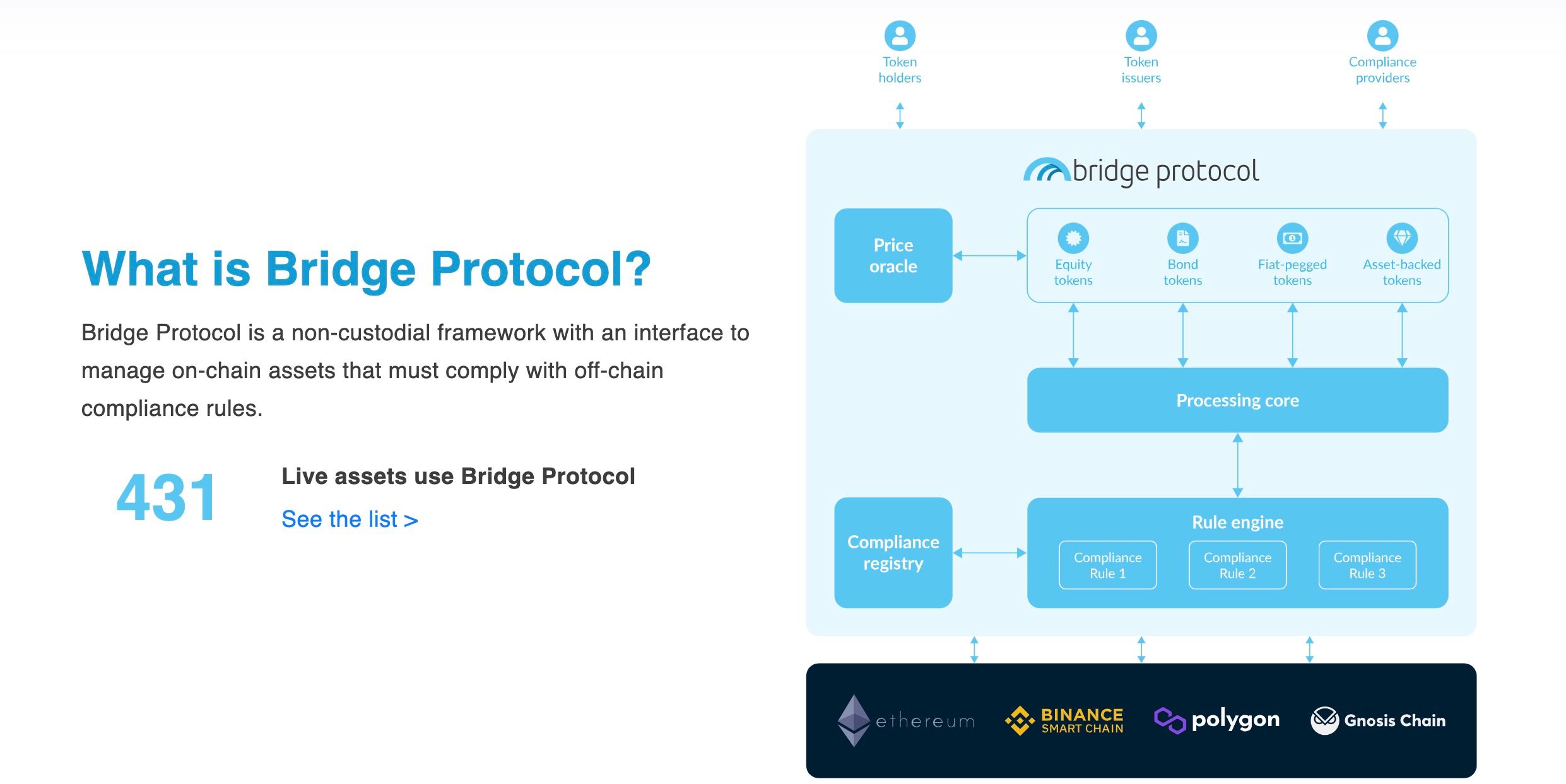 The Bridge Protocol is a non-custodial framework that allows users to interface with and manage on-chain assets that must comply with compliance rules, such as tokenized securities and shares.